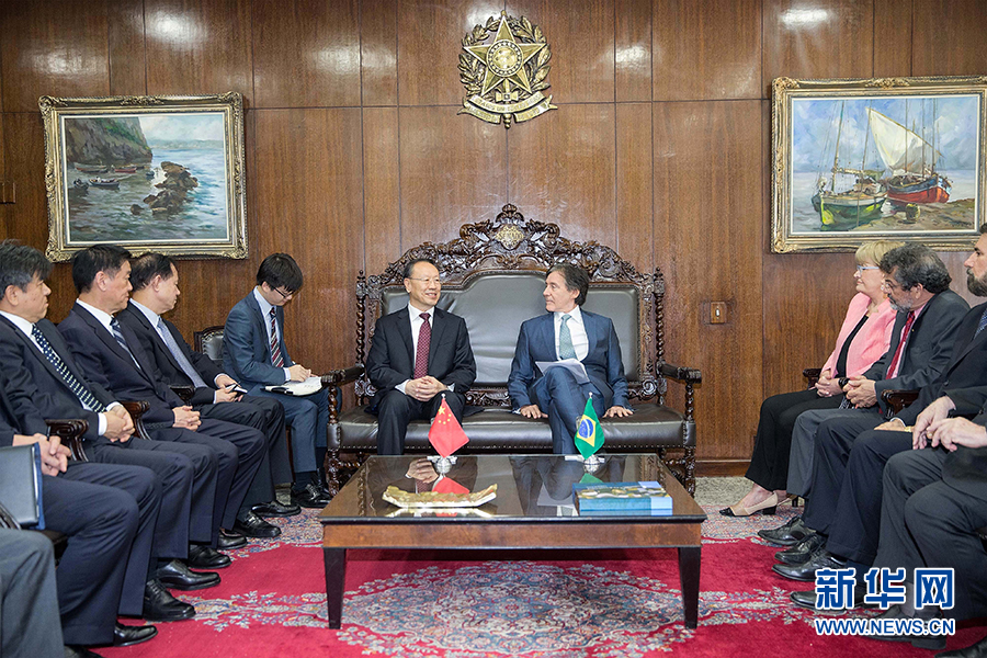 7月11日,在巴西首都巴西利亞,中共中央書(shū)記處書(shū)記、全國(guó)政協(xié)副主席杜青林(中左)會(huì)見(jiàn)巴西參議院議長(zhǎng)歐尼西奧·奧利維拉(中右)。新華社記者李明攝