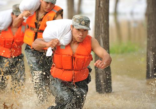 2013年8月17日,黑龍江省軍區(qū)預備役高炮師官兵在大慶市肇源縣超等鄉(xiāng)“駱駝脖子”江段抗洪。新華社發(fā)(呂衍海 攝)