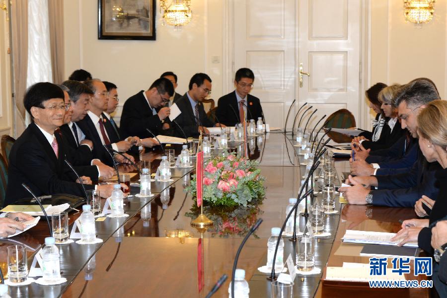 9月12日,克羅地亞總理普連科維奇(右二)在首都薩格勒布會(huì)見(jiàn)到訪的習(xí)近平主席特使、中共中央政治局委員、中央政法委書記孟建柱(左一)。新華社記者高磊攝