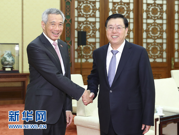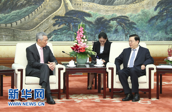 9月20日,中共中央政治局常委、全國(guó)人大常委會(huì)委員長(zhǎng)張德江在北京會(huì)見新加坡總理李顯龍。 新華社記者 謝環(huán)馳 攝