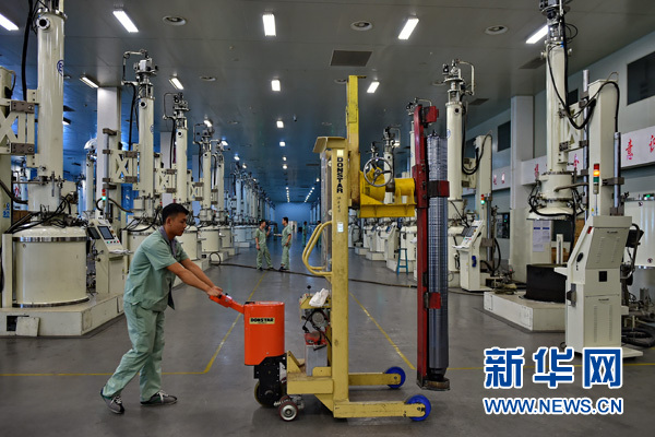 山西潞安集團(tuán)太陽能科技有限責(zé)任公司的工人在搬運(yùn)剛剛生產(chǎn)出的單晶硅棒(7月20日攝)。新華社記者 曹陽 攝