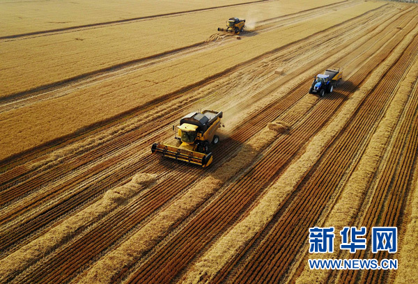 在河南??h中鶴現(xiàn)代農(nóng)業(yè)示范園區(qū)的麥田里,收割機(jī)在收獲小麥(6月7日攝)。新華社記者 李安 攝