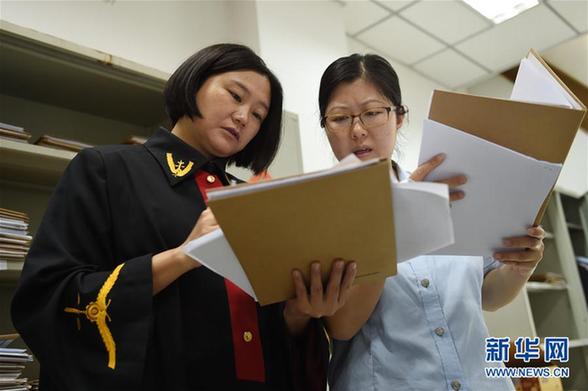 9月28日,北京市朝陽區(qū)人民法院奧運村人民法庭庭長劉黎(左)在開庭結(jié)束后與同事討論一起案件。新華社記者 鞠煥宗 攝