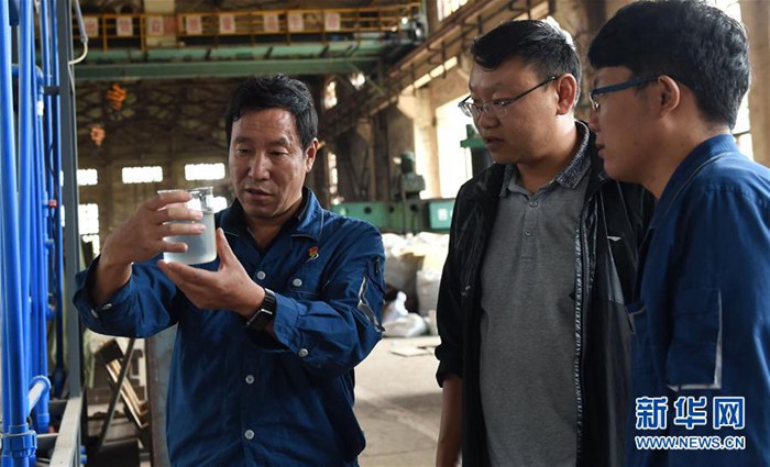 云南冶金昆明重工有限公司首席技師耿家盛(左)在車(chē)間里和助手查看生態(tài)環(huán)保廁所的沖水系統(tǒng)經(jīng)過(guò)循環(huán)后的水質(zhì)(9月22日攝)。新華社記者 藺以光 攝