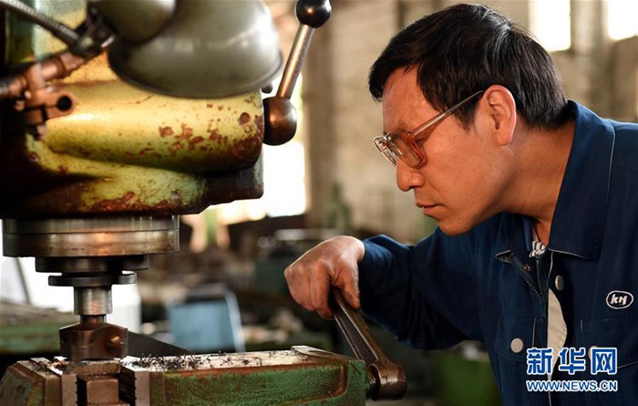 云南冶金昆明重工有限公司首席技師耿家盛在車(chē)間里操作銑床(2016年4月22日攝)。 新華社記者 藺以光 攝
