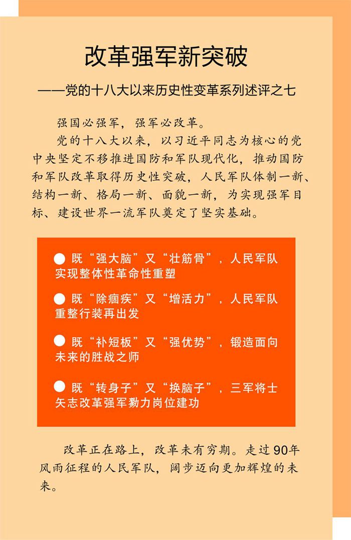 銳意面向未來,再造精兵勁旅。變革中的人民軍隊,必將勇立時代潮頭,向新的更大勝利揮師疾進。