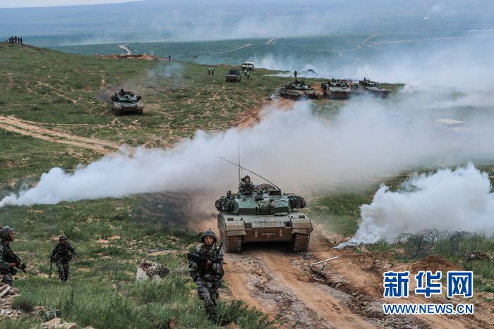 “跨越-2016·朱日和A”演習(xí)進入實兵對抗陣地進攻戰(zhàn),這是紅藍雙方首場對抗中紅軍步兵和坦克協(xié)同(2016年7月19日攝)。新華社發(fā)(王佳寅 攝)