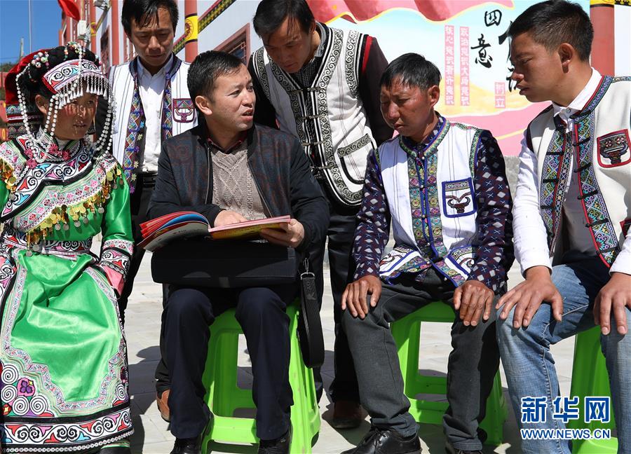 10月31日,十九大代表、貴州省六盤(pán)水市鐘山區(qū)大灣鎮(zhèn)海嘎村駐村第一書(shū)記楊波(前左二)向海嘎村彝族村民宣講十九大精神。新華社記者 劉續(xù) 攝
