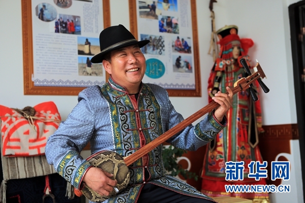 內(nèi)蒙古鄂爾多斯市鄂托克前旗昂素鎮(zhèn)牧民、黨員中心戶(hù)孟克巴雅爾為游客彈唱蒙古族“祝酒歌”(11月6日攝)。新華社記者 王婧嬙 攝