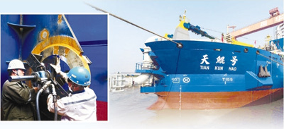 “船上鋼樁臺車安裝了4個大油缸,單個就達38噸,所有安裝誤差都只有0.2毫米”,安裝輪機車間主任沙勝紅說,“考驗還在繼續(xù)”。輪機車間的工人全部是訓練有素的技術員工,他們克服了難以想象的困難,硬是拿下全船高難度的設備安裝工作,質量贏得船東、船檢的一致好評。