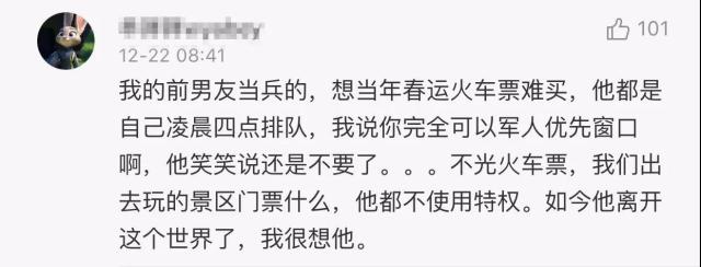 @宇:我去年夏天在蘭州站親眼看見(jiàn)一位被召回的軍官著急買(mǎi)票歸隊(duì),被排隊(duì)的人罵沒(méi)素質(zhì),售票人員也不給優(yōu)先。最后我就讓他排我前面了。他們?yōu)閲?guó)家人民付出太多,愛(ài)護(hù)軍人,才是愛(ài)護(hù)自己。