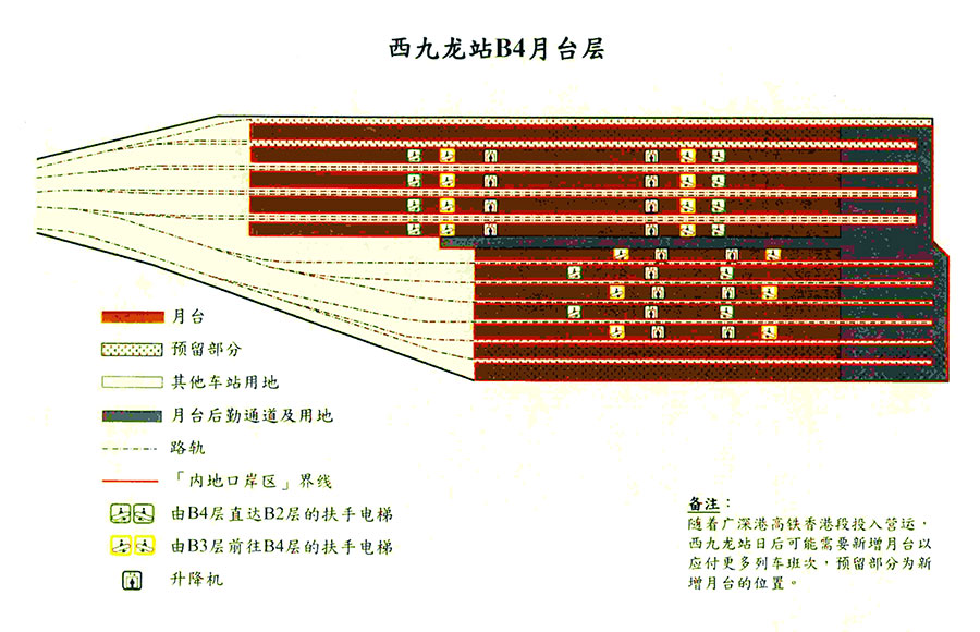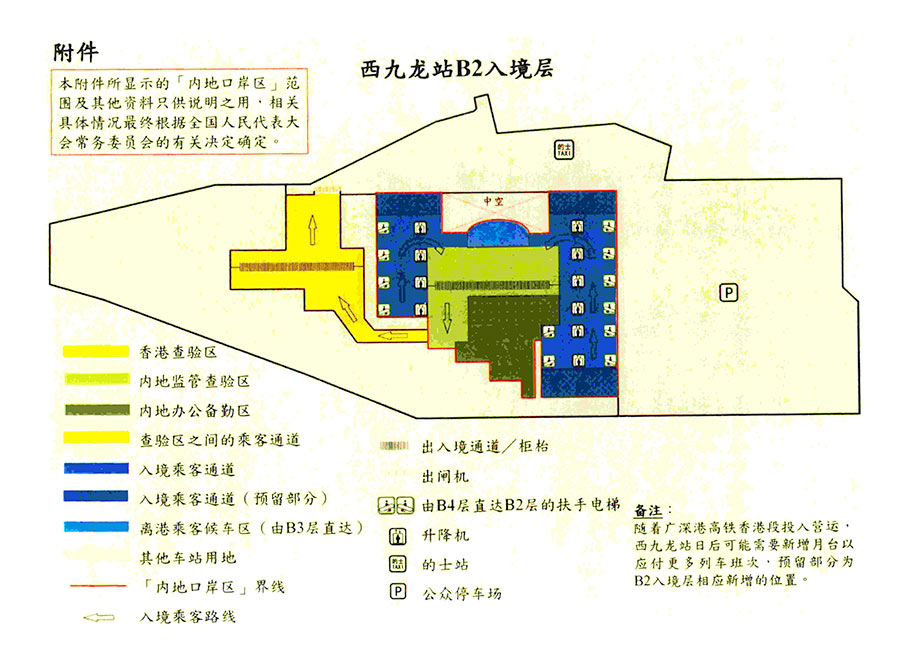 第二條 內(nèi)地口岸區(qū)的范圍為西九龍站地下二、三層的劃定區(qū)域、地下四層月臺(tái)區(qū)域及有關(guān)連接通道,包括內(nèi)地監(jiān)管查驗(yàn)區(qū)、辦公備勤區(qū)、離港乘客候車(chē)區(qū)、車(chē)站月臺(tái)和連接通道及電梯。內(nèi)地口岸區(qū)范圍的詳情見(jiàn)附件。