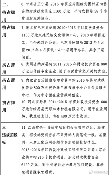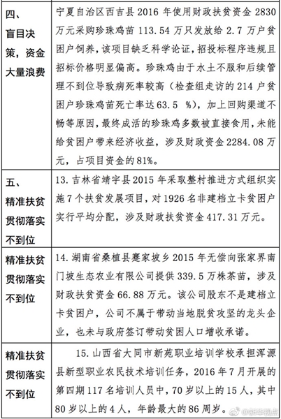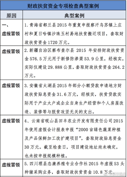 “發(fā)現(xiàn)一起、查處一起、絕不姑息!”財政部監(jiān)督檢查局有關負責人指出,此次檢查發(fā)現(xiàn)了一批違法違規(guī)問題,本著“零容忍”態(tài)度已進行了嚴肅處理。從檢查發(fā)現(xiàn)問題中的一些典型案例看,虛報冒領、擠占挪用、違規(guī)招投標、盲目決策導致資金大量浪費、精準扶貧貫徹落實不到位是當前濫用扶貧資金的主要問題所在。