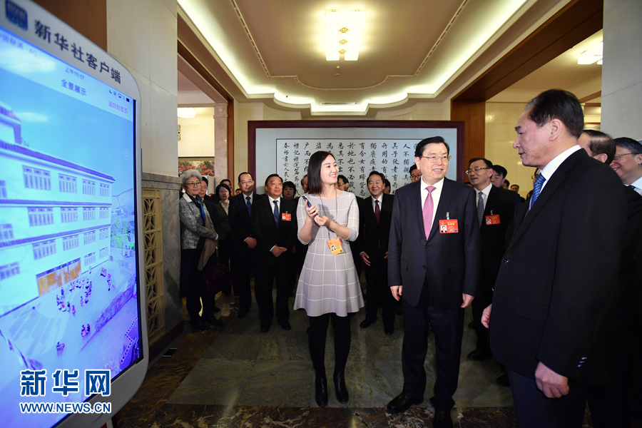 3月14日上午,中共中央政治局常委、全國人大常委會委員長張德江在北京人民大會堂看望參加十二屆全國人大五次會議新聞報(bào)道工作的中央主要媒體負(fù)責(zé)人和工作人員,代表大會主席團(tuán)向所有參加人大會議報(bào)道的新聞工作者表示誠摯慰問和衷心感謝。這是新華社社長蔡名照陪同張德江觀看新華社新聞產(chǎn)品演示。 新華社記者李濤攝