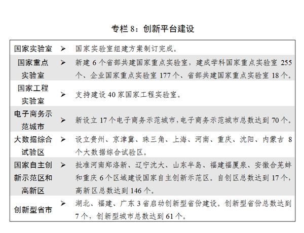 一是創(chuàng)新能力持續(xù)提升。由點(diǎn)及面、有序布局重大科技創(chuàng)新平臺(tái)建設(shè),深入推進(jìn)8個(gè)區(qū)域全面創(chuàng)新改革試驗(yàn)。北京、上海建設(shè)科技創(chuàng)新中心邁出新步伐。河北·京南、浙江、寧波3個(gè)國(guó)家科技成果轉(zhuǎn)移轉(zhuǎn)化示范區(qū)啟動(dòng)建設(shè)。首個(gè)國(guó)家高速列車技術(shù)創(chuàng)新中心建成。完全自主知識(shí)產(chǎn)權(quán)中國(guó)標(biāo)準(zhǔn)高速列車正式投入運(yùn)營(yíng)。建成世界最大單口徑射電望遠(yuǎn)鏡(FAST)等一批重大科技基礎(chǔ)設(shè)施,在量子通信、航空航天等方面取得一批重大科技成果。國(guó)家科技重大專項(xiàng)深入實(shí)施,科技創(chuàng)新2030-重大項(xiàng)目遴選確定。大力推動(dòng)企業(yè)技術(shù)創(chuàng)新,落實(shí)好研發(fā)費(fèi)用加計(jì)扣除、股權(quán)激勵(lì)和技術(shù)入股所得稅優(yōu)惠、完善高新技術(shù)企業(yè)認(rèn)定辦法等政策。