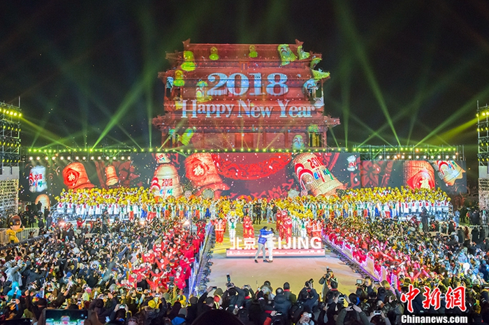2018年1月1日,2018北京新年倒計時活動暨北京冰雪文化旅游節(jié)開幕式在北京永定門南廣場舉行。多國駐華使節(jié)、首都各行業(yè)的“北京榜樣”、北京旅游行業(yè)代表、中外游客、學生和市民代表共一千余人共同迎接新年的到來。中新網(wǎng)記者 富宇 攝