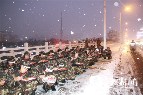 官兵們在暴雪中緊急就餐