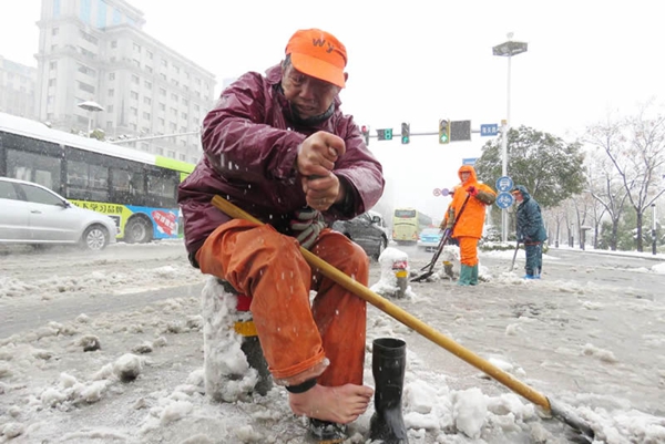 通訊電纜被壓落導致交通癱瘓 執(zhí)勤協(xié)警爬上公交車頂 用雙手托舉電纜線10多分鐘 城管 暖心! 南京城管掃雪打通道路 兩歲小女孩跑過來說“謝謝叔叔” 環(huán)衛(wèi)工人 擰干濕透的襪子