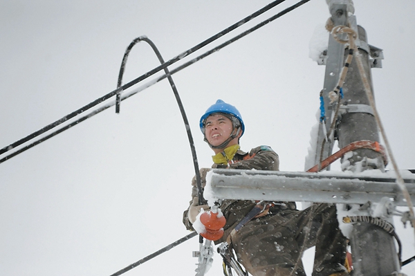 巡線人員冒著大雪