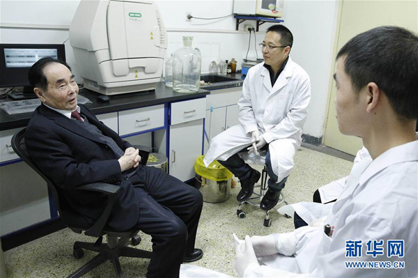 侯云德院士(左)在實(shí)驗(yàn)室與學(xué)生交流(2017年12月27日攝)。新華社記者 張玉薇 攝