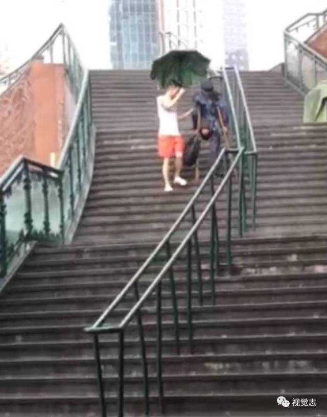 下雨天,人們匆匆趕路,一個(gè)小哥哥在幫一個(gè)乞討老人撐傘,慢慢扶他下樓梯。