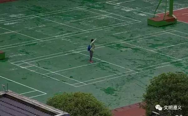 當(dāng)他跑到操場(chǎng)時(shí),突然聽到國(guó)歌聲響起,他立刻佇立風(fēng)雨中面向國(guó)旗敬禮。