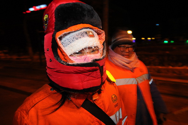 1月23日,在黑龍江省牡丹江市西安區(qū),環(huán)衛(wèi)工們完成晨掃,帽子上結(jié)著霜花。新華社發(fā)(張春祥 攝)