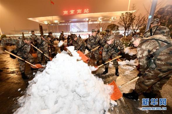 1月5日,東部戰(zhàn)區(qū)陸軍“臨汾旅”官兵在南京南站北廣場掃雪除冰。新華社發(fā)(于同化 攝)