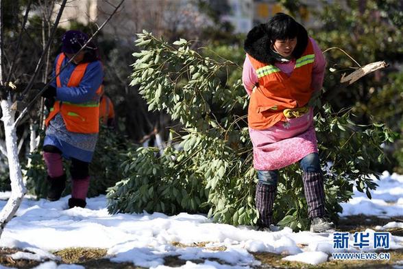 1月11日,持續(xù)大雪將合肥很多城市綠化樹木壓折,幾名綠化工人在清理折斷的樹枝。新華社記者劉軍喜攝