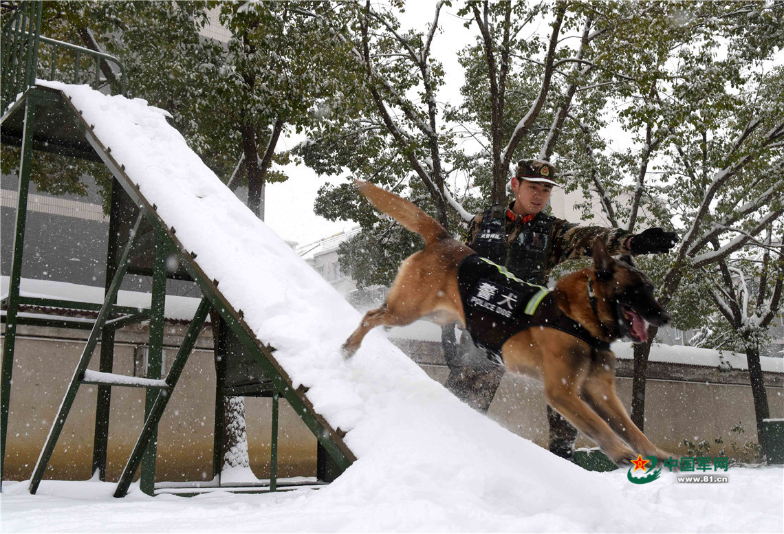 1月27日,武警安徽總隊(duì)機(jī)動(dòng)支隊(duì)警犬班班長王營廣帶領(lǐng)警犬“魯克”通過障礙。