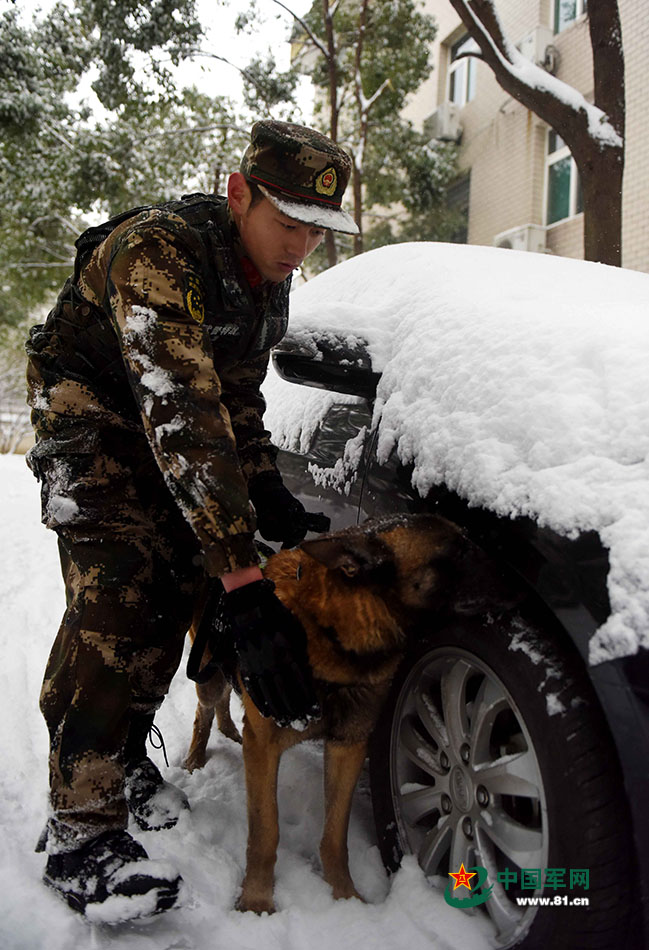 1月27日,武警安徽總隊(duì)機(jī)動(dòng)支隊(duì)警犬班班長(zhǎng)王營(yíng)廣帶領(lǐng)警犬“魯克”進(jìn)行車輛搜爆訓(xùn)練。