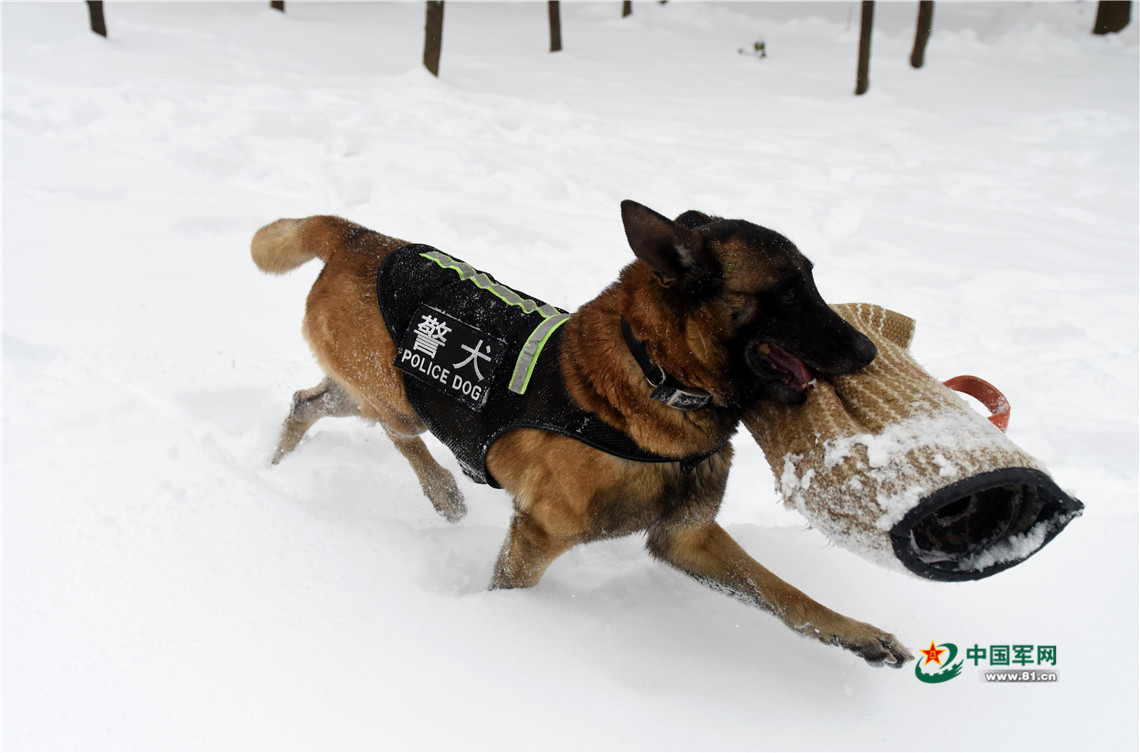 1月27日,武警安徽總隊機動支隊警犬班班長王營廣帶領(lǐng)警犬“魯克”進行搜尋訓練。