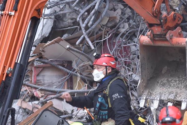2月7日,救援人員在一處倒塌建筑前救援。新華社記者 岳月偉 攝
