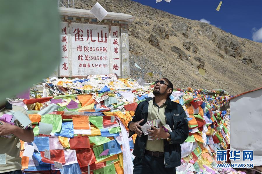其美多吉在雀兒山埡口拋撒龍達(dá)祈福(2017年8月26日攝)。新華社記者 吳光于 攝