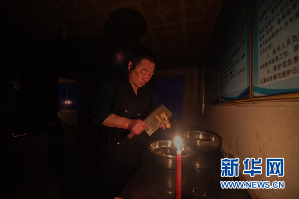 燭光搖曳,白玉華一一清洗凍白菜、土豆和鮮肉,這是他年夜飯的所有食材。這幾天喝水成了問(wèn)題,用的水是他從20公里之外的河溝中鑿取的冰塊。兩天前,站上的柴油發(fā)電機(jī)壞了,不能抽取井水。大雪封山,車行困難,機(jī)器無(wú)法維修?!斑@機(jī)器也知道過(guò)年給自己‘放假’?!卑子袢A苦笑地?fù)u搖頭。