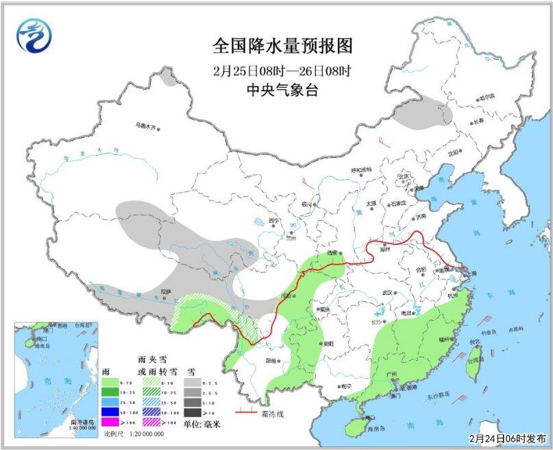 25日08時至26日08時,青藏高原中部和南部等地有小雪或雨夾雪;西北地區(qū)東南部、四川盆地、江南南部、華南中東部、云南西北部和東部、海南島、臺灣等地有小雨或陣雨。內(nèi)蒙古中西部等地有4~5級風(fēng)。東海大部、臺灣海峽等海域有6~7級、陣風(fēng)8級的東北風(fēng)。