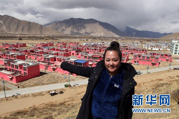 索朗央吉站在“四季吉祥村”前(3月6日攝)。新華社記者 覺果 攝