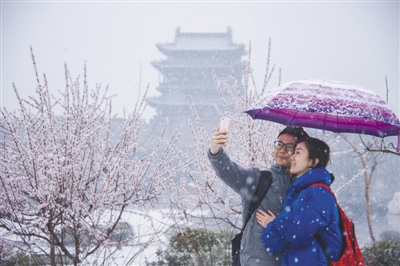 陰晴雨雪關系百姓生活,因此廣受關注。圖為日前山西省晉中市平遙縣迎來降雪天氣,游客在古城門外合影留念。梁生仁攝(新華社發(fā))