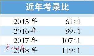 記者查詢近年廣州市公務(wù)員考試的數(shù)據(jù)發(fā)現(xiàn),近幾年競爭越發(fā)激烈,2015年計劃招錄738人,44825人成功通過審核并繳費,61∶1的平均考錄競爭比已經(jīng)高出歷史平均水平。2016年,廣州市公務(wù)員考試計劃招錄1090人,成功報名人數(shù)為97182人,平均考錄競爭比約為89∶1。到了2017年,廣州市公務(wù)員考試分為廣州和北京“雙考區(qū)”進行,計劃招錄924人,成功報名人數(shù)為99038人,平均考錄競爭比約為107∶1,競爭激烈程度超越往年。2018年廣州市公務(wù)員考試恢復(fù)單考區(qū),共設(shè)592個職位,計劃招錄722人,比起去年大幅減少,但有85770人成功報名,平均考錄競爭比達(dá)到119∶1,幾乎是2015年61∶1考錄競爭比的兩倍。