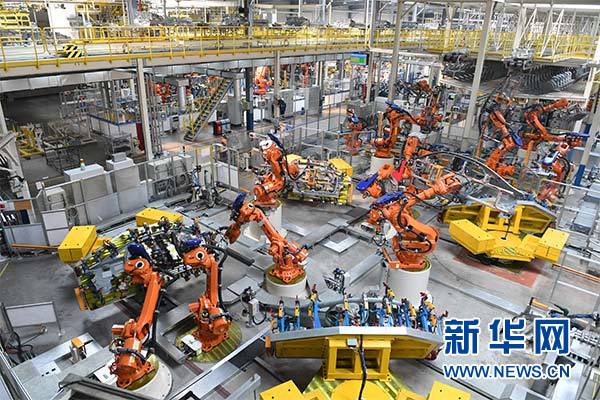 3月27日,焊接機(jī)器人在浙江臨海的吉利汽車生產(chǎn)車間工作。新華社記者 殷博古 攝