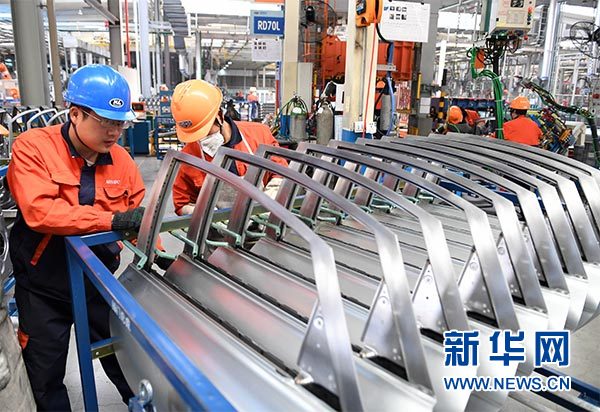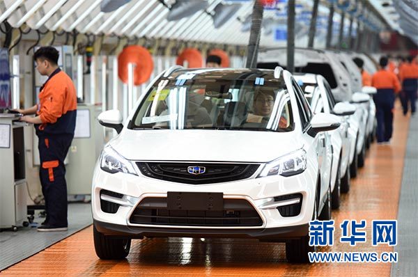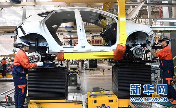 3月27日,工人們?cè)谡憬R海的吉利汽車生產(chǎn)車間工作。新華社記者 殷博古 攝
