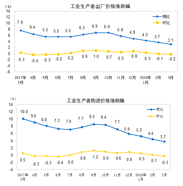 2018年3月份,全國(guó)工業(yè)生產(chǎn)者出廠價(jià)格同比上漲3.1%,環(huán)比下降0.2%。工業(yè)生產(chǎn)者購(gòu)進(jìn)價(jià)格同比上漲3.7%,環(huán)比下降0.3%。一季度,工業(yè)生產(chǎn)者出廠價(jià)格同比上漲3.7%,工業(yè)生產(chǎn)者購(gòu)進(jìn)價(jià)格同比上漲4.4%。