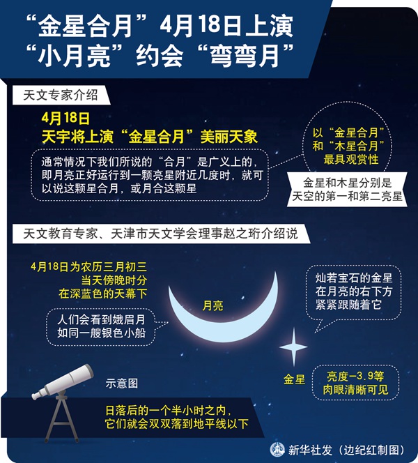 新華社天津4月16日電(記者 周潤(rùn)健)天文專家介紹,4月18日天宇將上演“金星合月”美麗天象,在天氣晴朗的條件下,公眾可一睹有著“維納斯”之稱的金星與一彎娥眉月相依相伴的迷人場(chǎng)景。