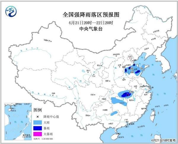 中央氣象臺4月21日18時繼續(xù)發(fā)布暴雨藍(lán)色預(yù)警: