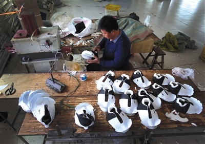 2017年4月28日,河北省安新縣崔公堤村,位于白洋淀以西,村內(nèi)鞋廠眾多,工人正在加工鞋面。新京報記者 王貴彬 攝
