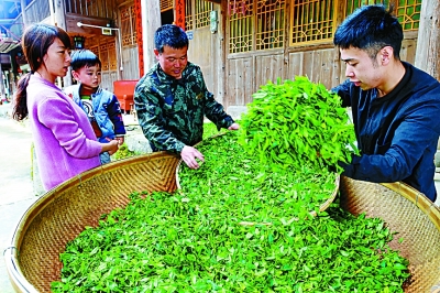 在福建省武夷山國家級自然保護區(qū)內(nèi)的桐木村,回鄉(xiāng)創(chuàng)業(yè)的大學畢業(yè)生徐建(右)攤晾鮮茶葉。新華社發(fā)