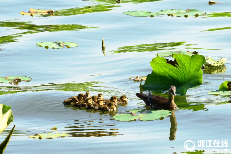 5月15日,西湖斷橋荷塘出現(xiàn)了今年第4窩小鴛鴦,此次共10只。與西湖第1窩時的獨苗相比,此窩可算是一個大家庭, 這讓鴛鴦媽媽忙不過來了。(浙江在線拍友 里爾 攝)