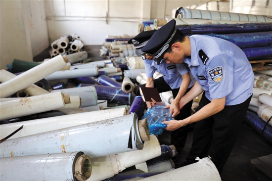 ▲ 黃埔海關(guān)緝私局民警查看走私進(jìn)口的廢塑料薄膜 馬漢青 濮宣 攝