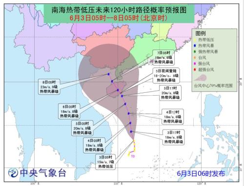 預(yù)計(jì),低壓中心將以每小時(shí)10公里左右的速度向偏北方向移動(dòng),強(qiáng)度逐漸加強(qiáng),將于3日白天到夜間發(fā)展為今年第4號(hào)臺(tái)風(fēng)(熱帶風(fēng)暴級(jí)),并逐漸向海南島東部一帶沿??拷?。