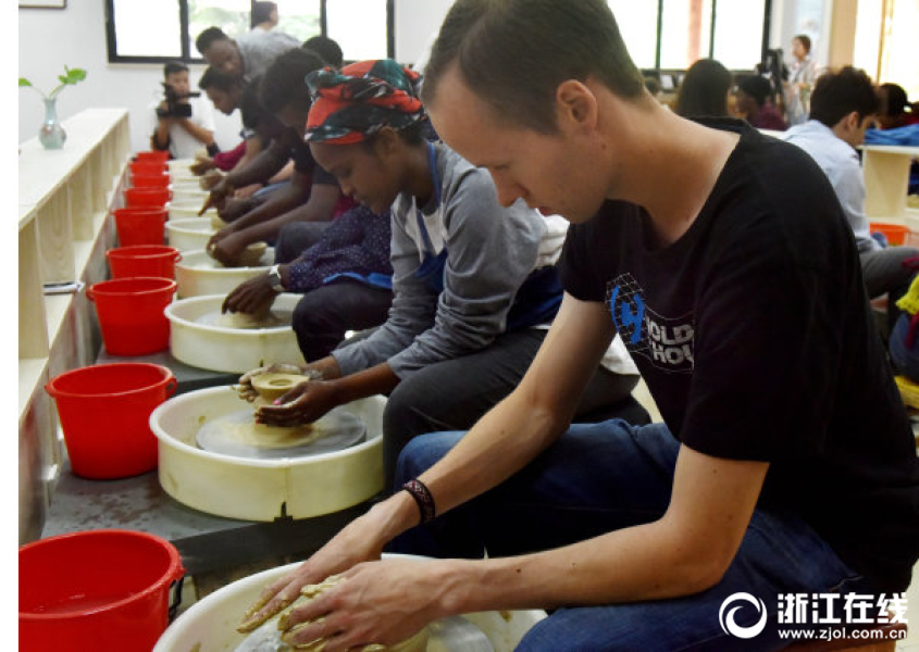 6月3日,浙師大外國留學(xué)生,在武義漢坊婺窯體驗館學(xué)陶藝。婺州窯,始于三國時期,是金華市第四批國家非物質(zhì)文化遺產(chǎn)代表性項目。當(dāng)日,來自美國、俄羅斯等30多個國家的浙江師范大學(xué)70多名留學(xué)生,在武義漢坊婺窯體驗館開心學(xué)習(xí)拉坯、修坯、上釉等陶藝生產(chǎn)環(huán)節(jié)。留學(xué)生們還把自己的國籍、姓名刻在親手做的陶瓷器皿上,委托燒制、留作紀念。(拍友 張建成 攝)